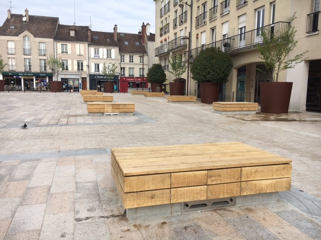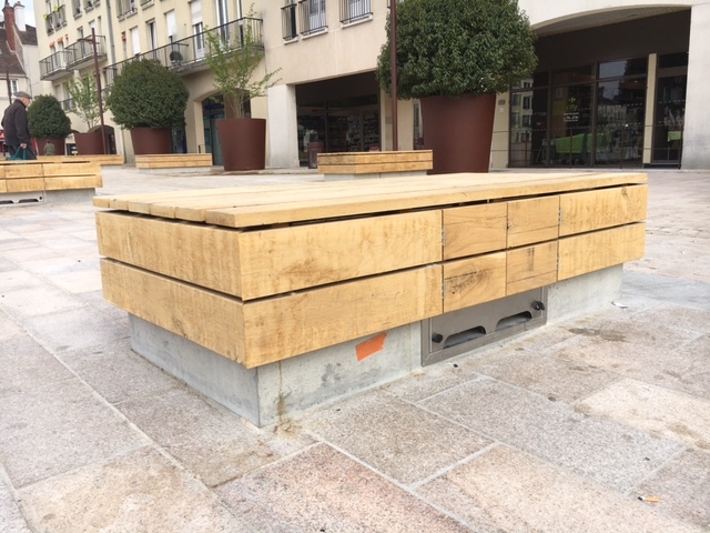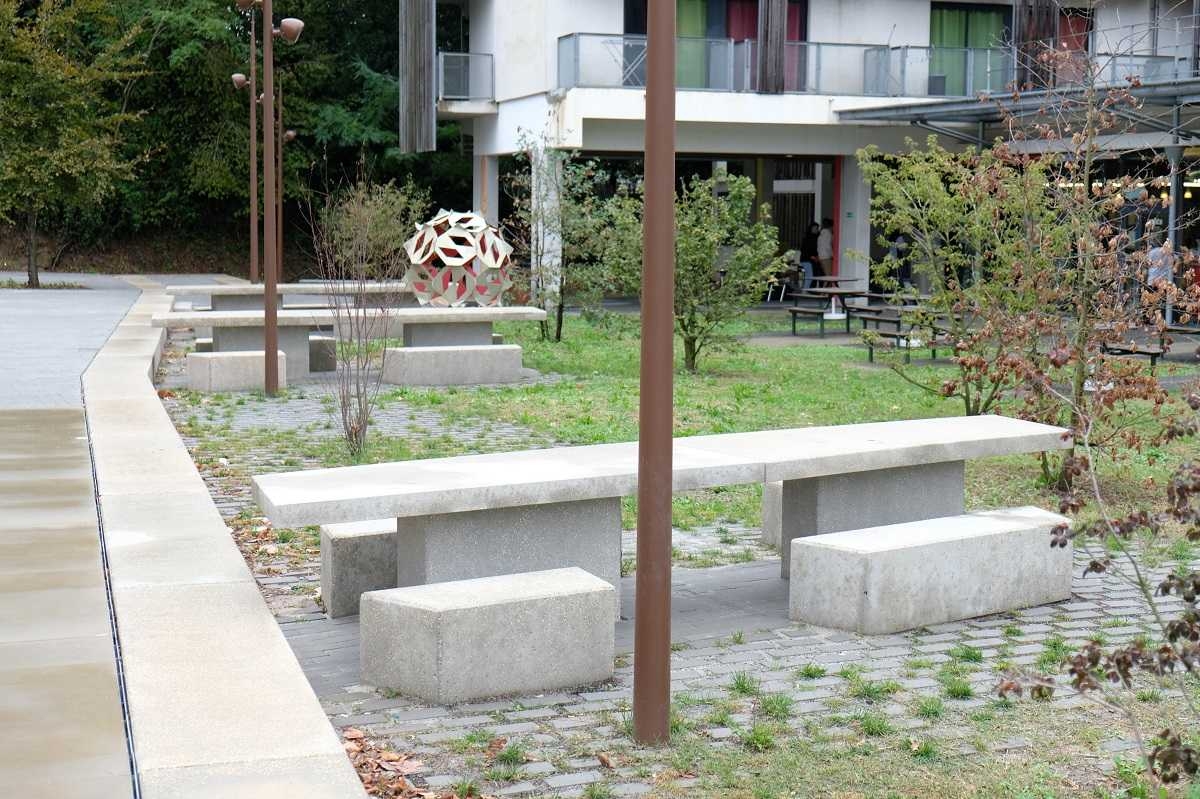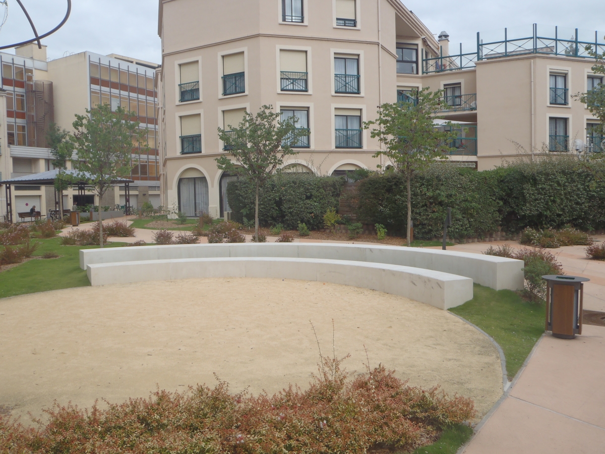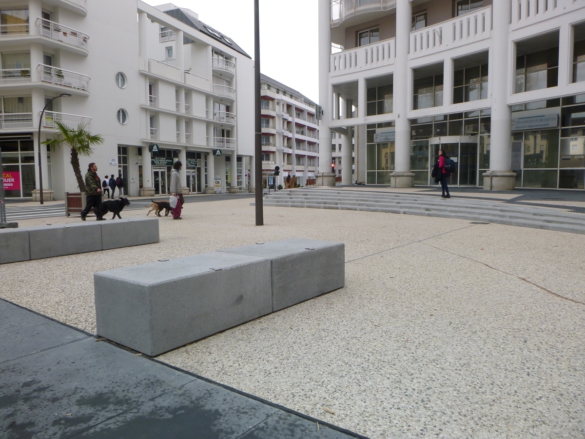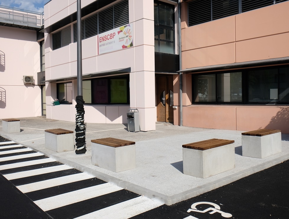 Madame Carvel souhaitait un mobilier urbain qui s'adosserait aux plantations tout en soulignant la géométrie des massifs, la structure et les couleurs du parvis, afin de créer des lieux de convivialité.