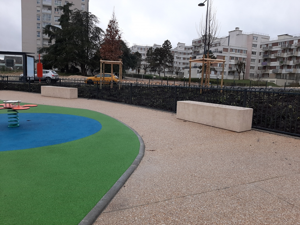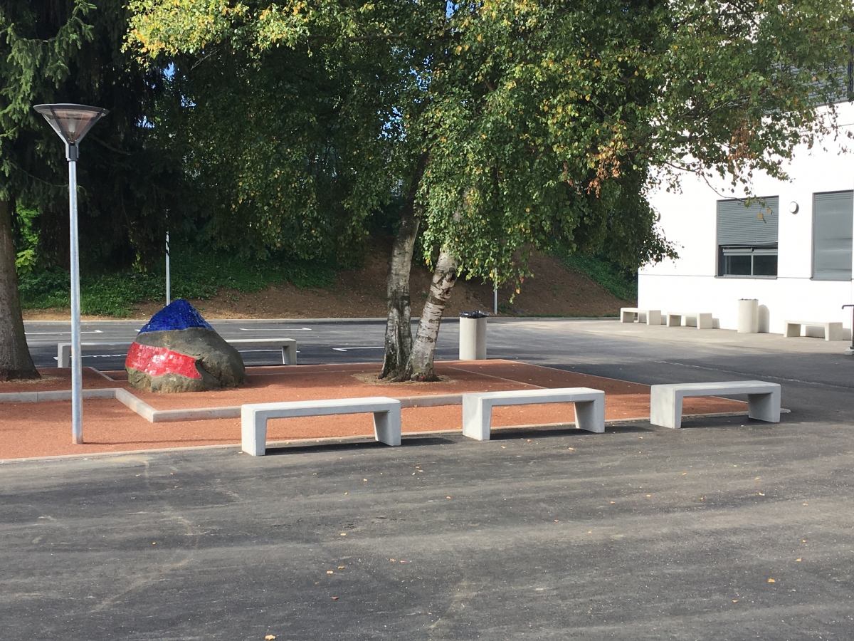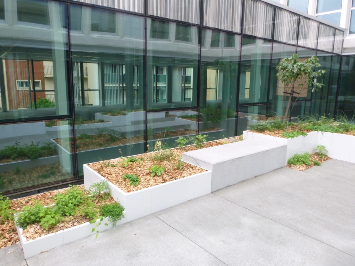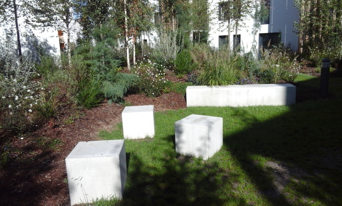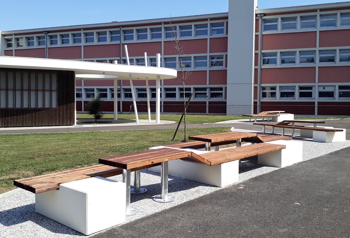 Madame Carvel souhaitait un mobilier urbain qui s'adosserait aux plantations tout en soulignant la géométrie des massifs, la structure et les couleurs du parvis, afin de créer des lieux de convivialité.