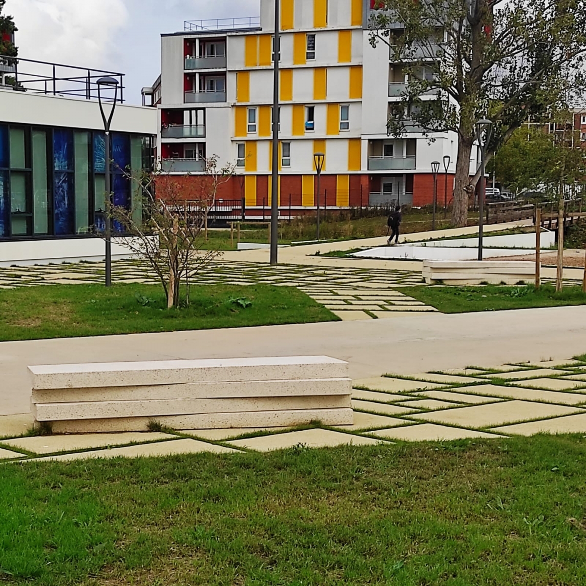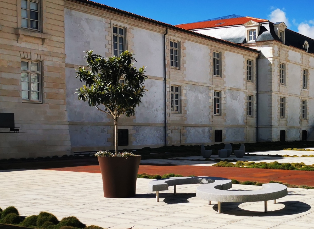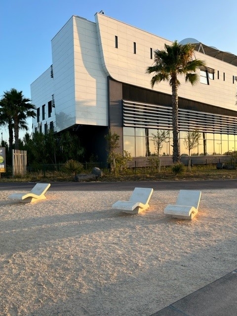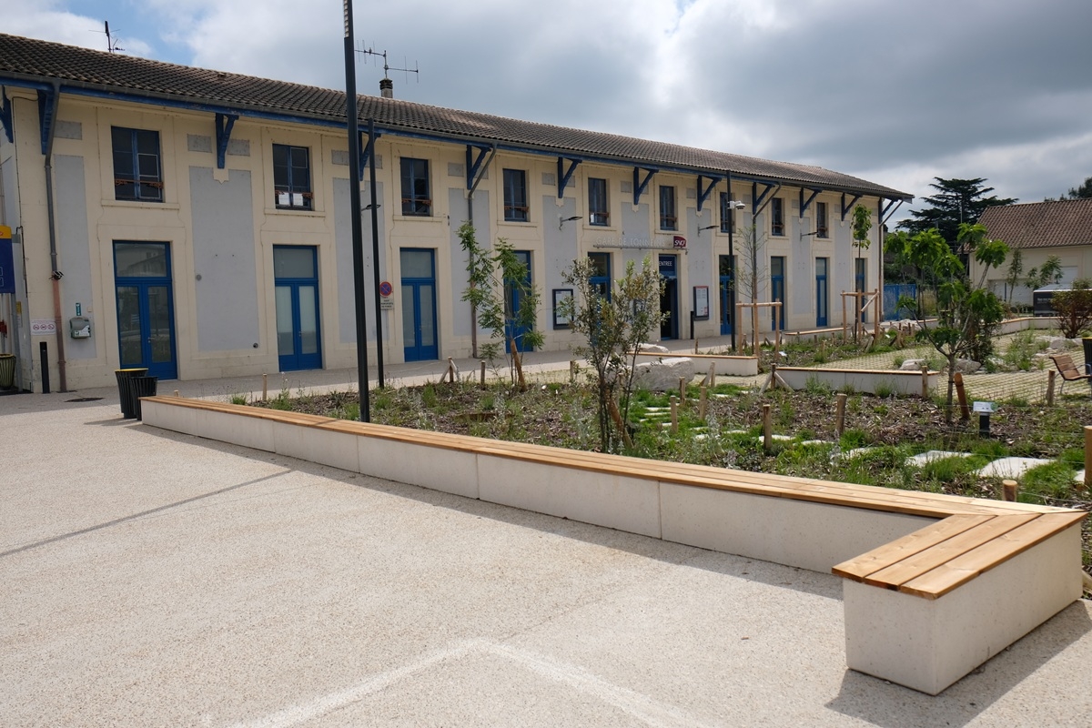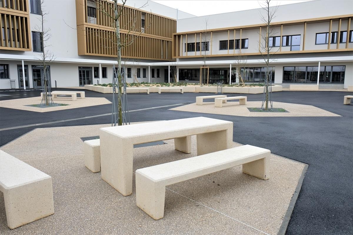Madame Carvel souhaitait un mobilier urbain qui s'adosserait aux plantations tout en soulignant la géométrie des massifs, la structure et les couleurs du parvis, afin de créer des lieux de convivialité.