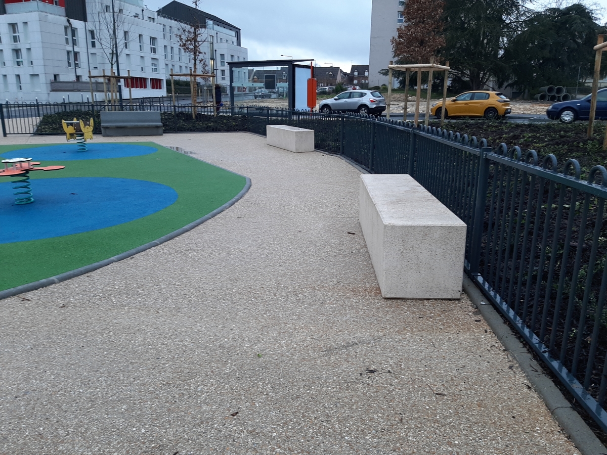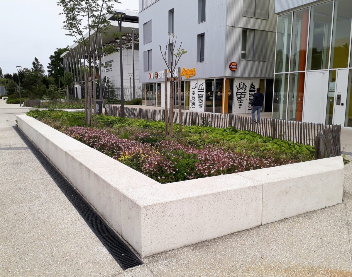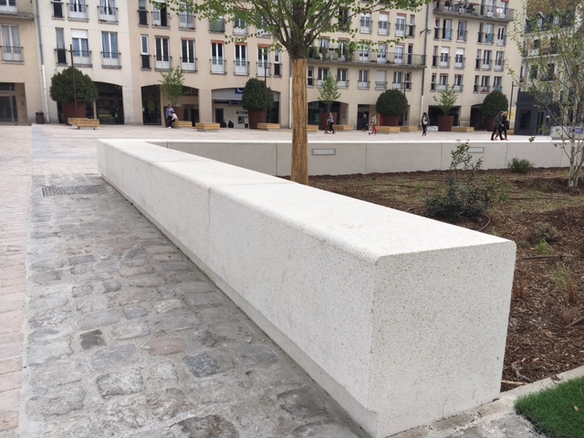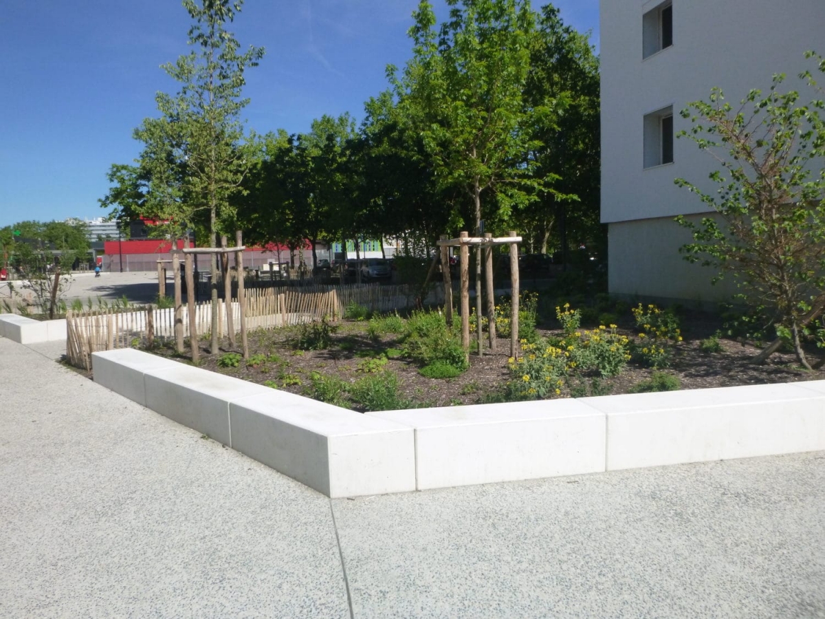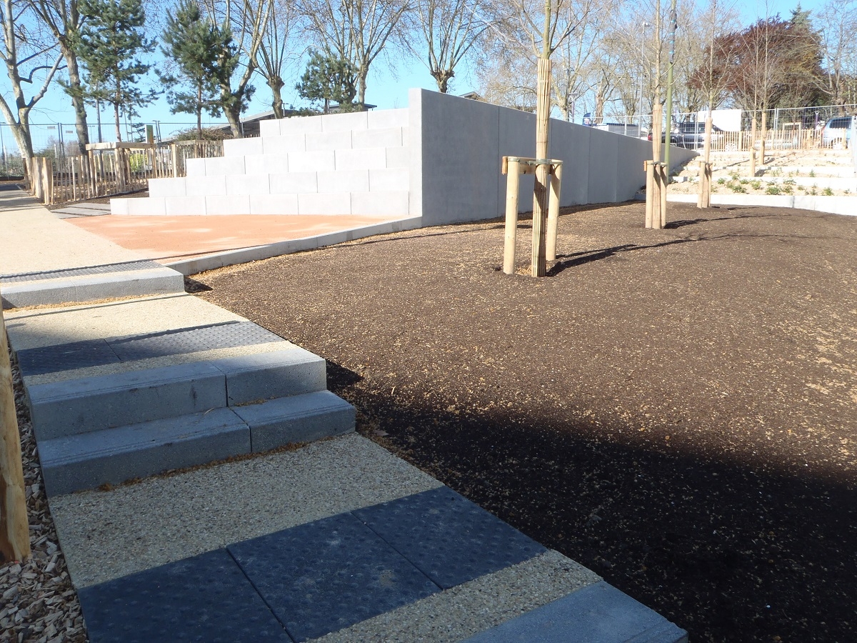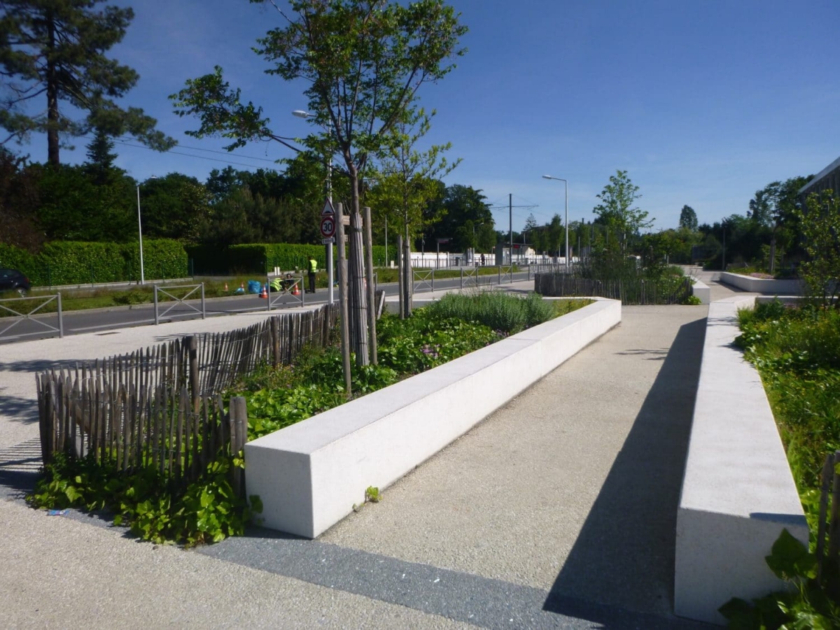 L'ingénieur paysagiste, Mme Ruelloux souhaitait des éléments préfabriqués avec la même matière, la même finition et pouvant être mis en œuvre avec différents revêtements.