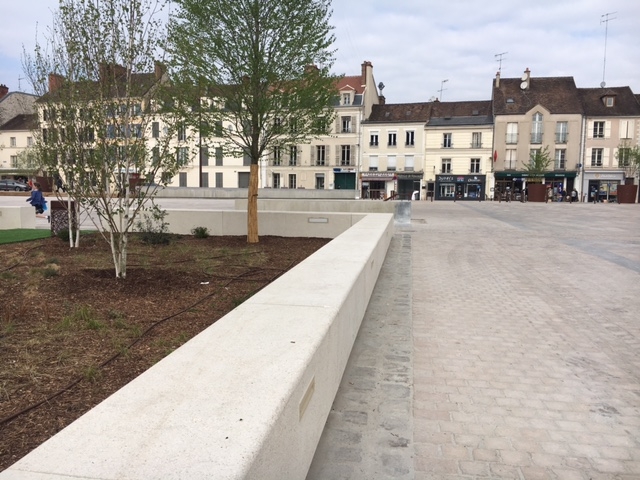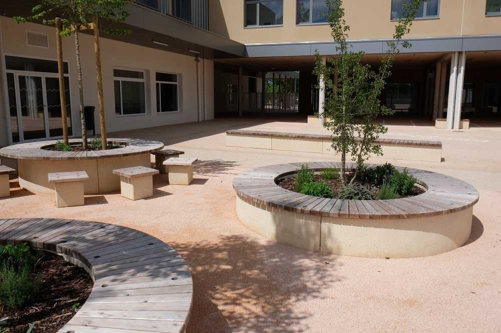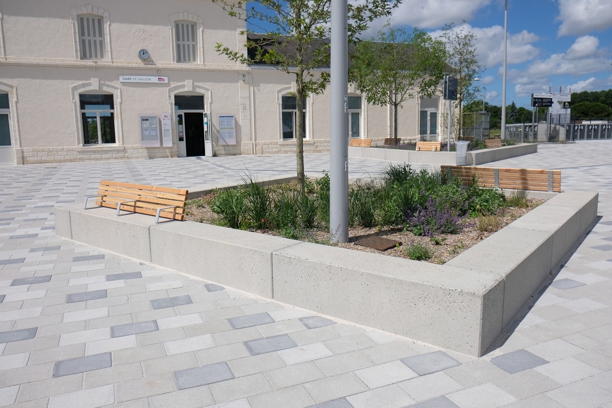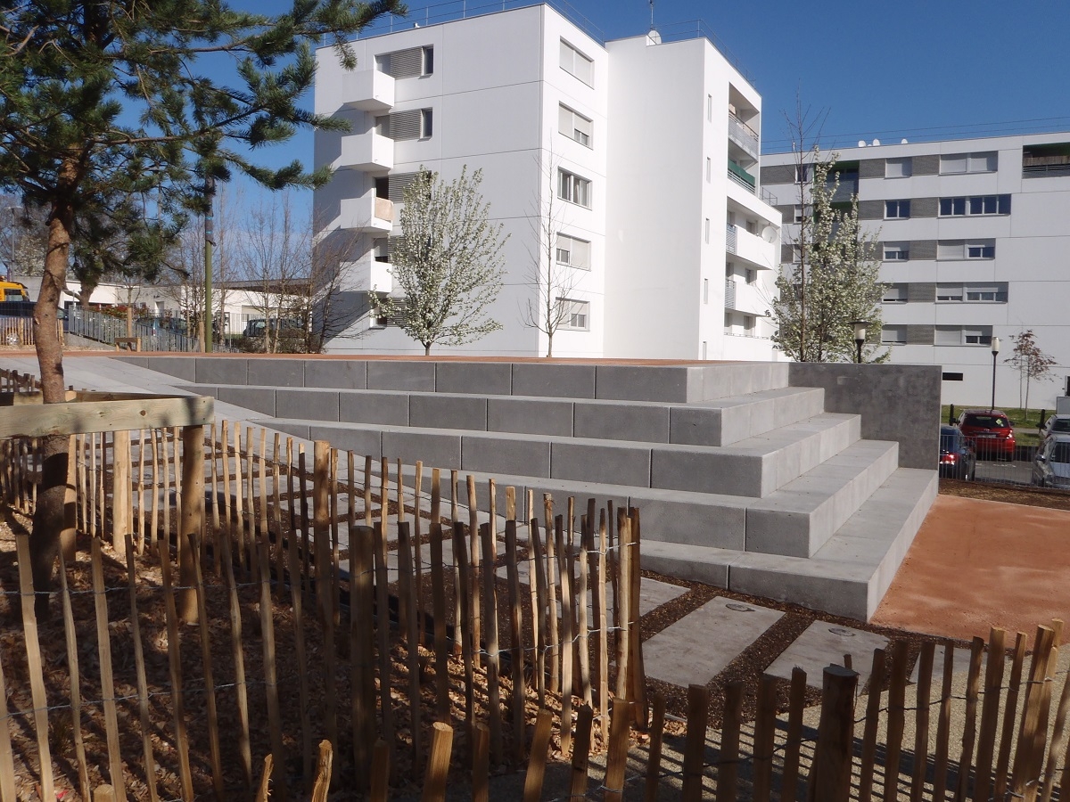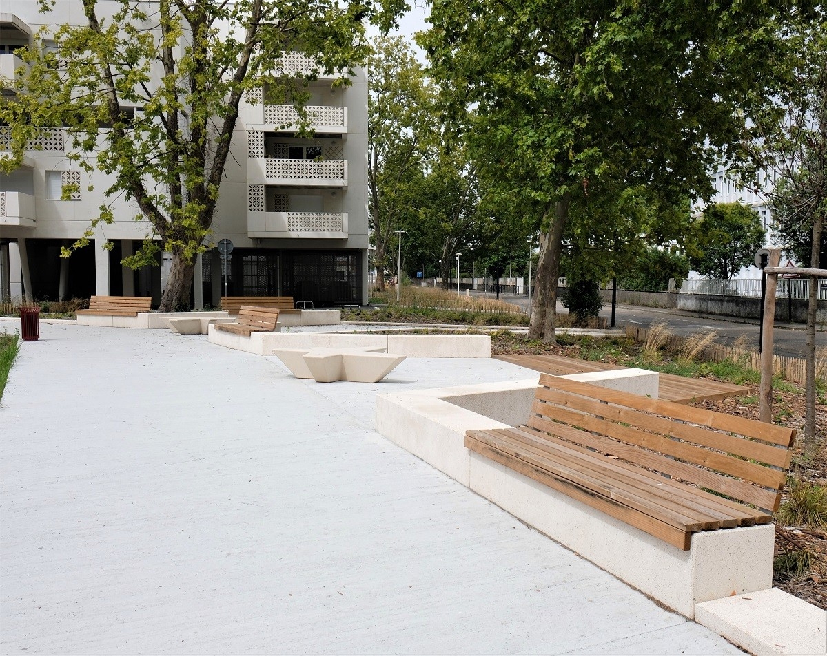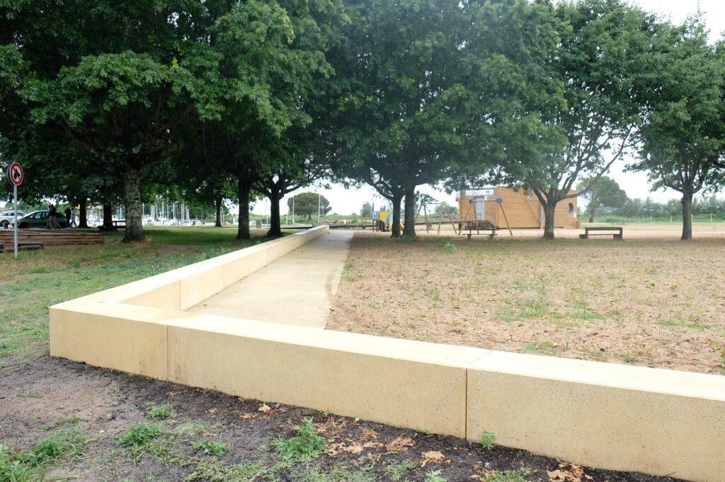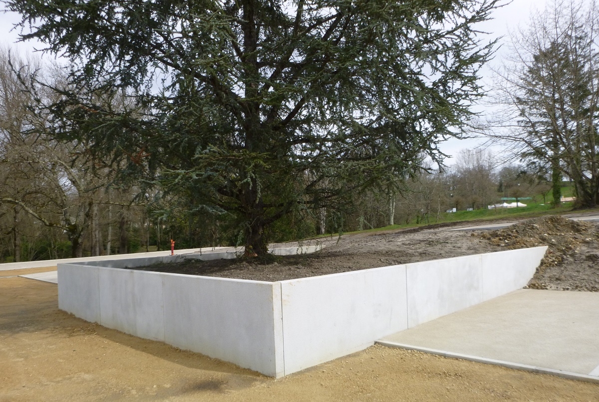 L'ingénieur paysagiste, Mme Ruelloux souhaitait des éléments préfabriqués avec la même matière, la même finition et pouvant être mis en œuvre avec différents revêtements.