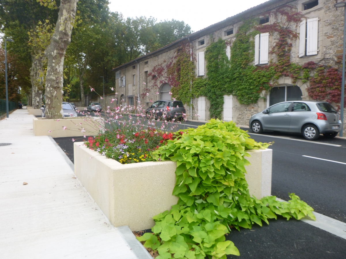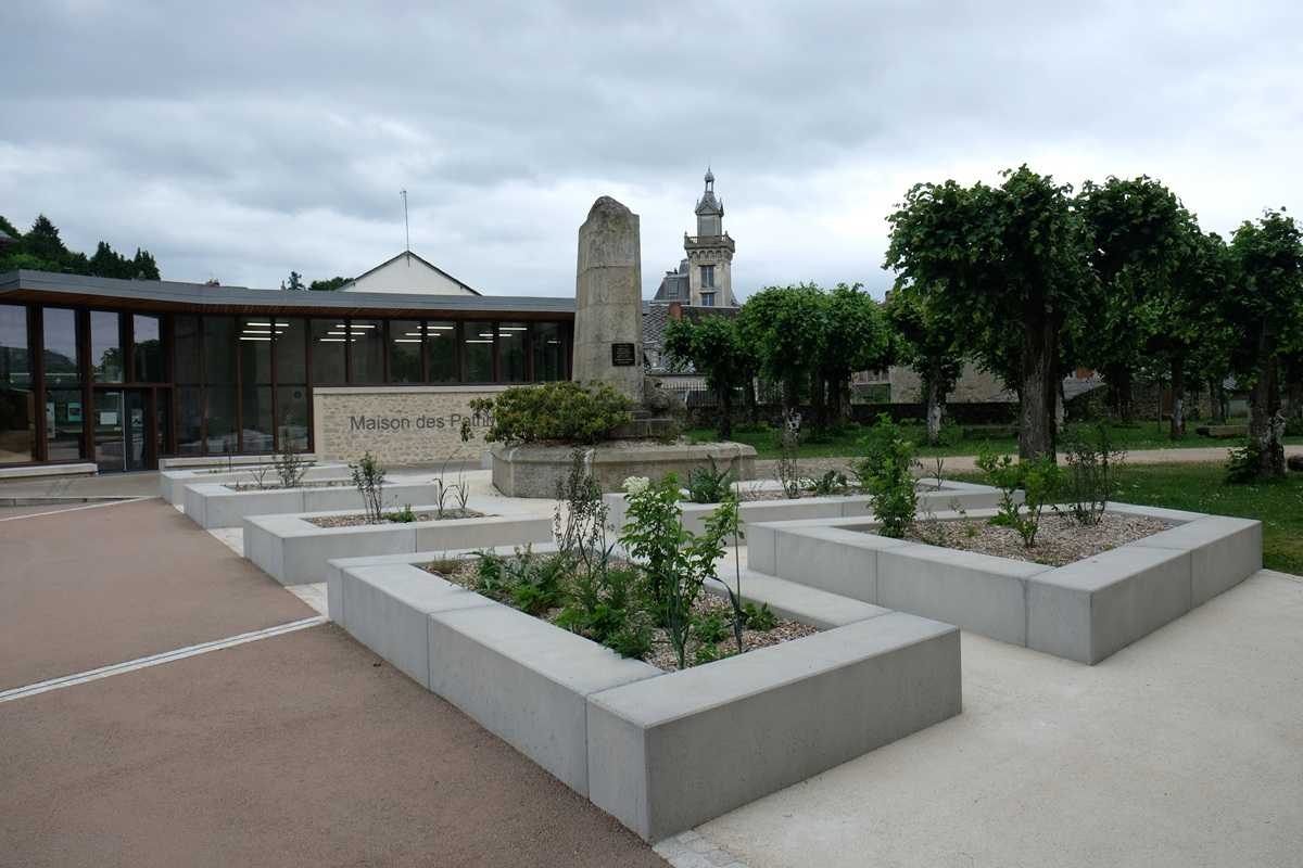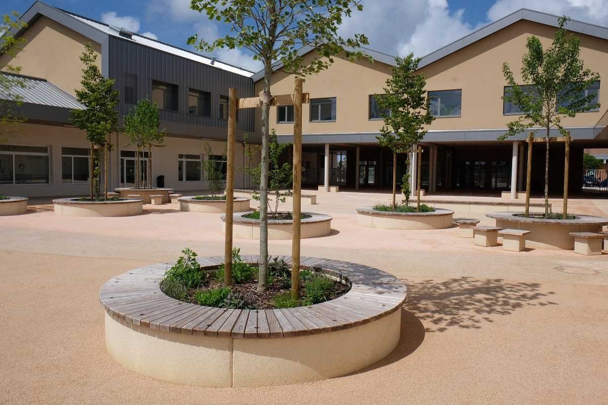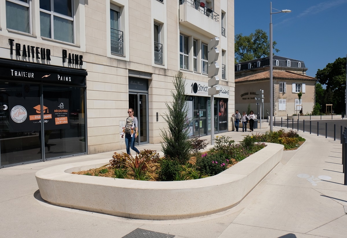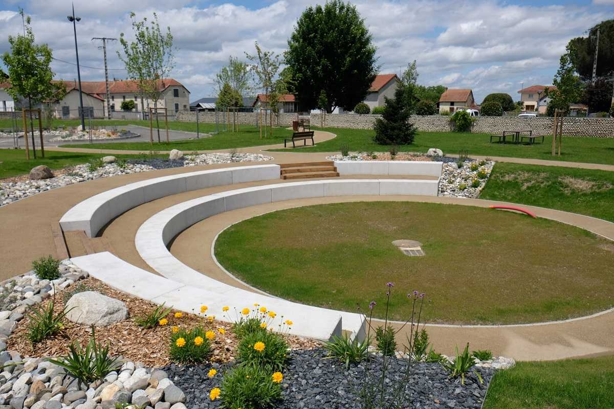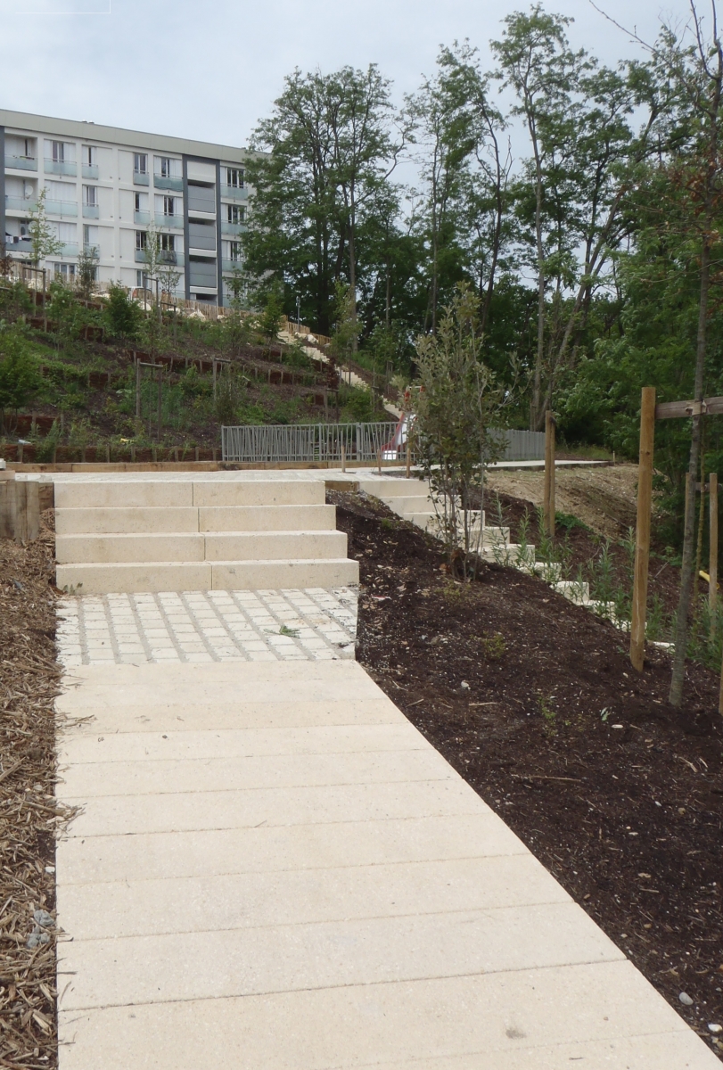 L'ingénieur paysagiste, Mme Ruelloux souhaitait des éléments préfabriqués avec la même matière, la même finition et pouvant être mis en œuvre avec différents revêtements.