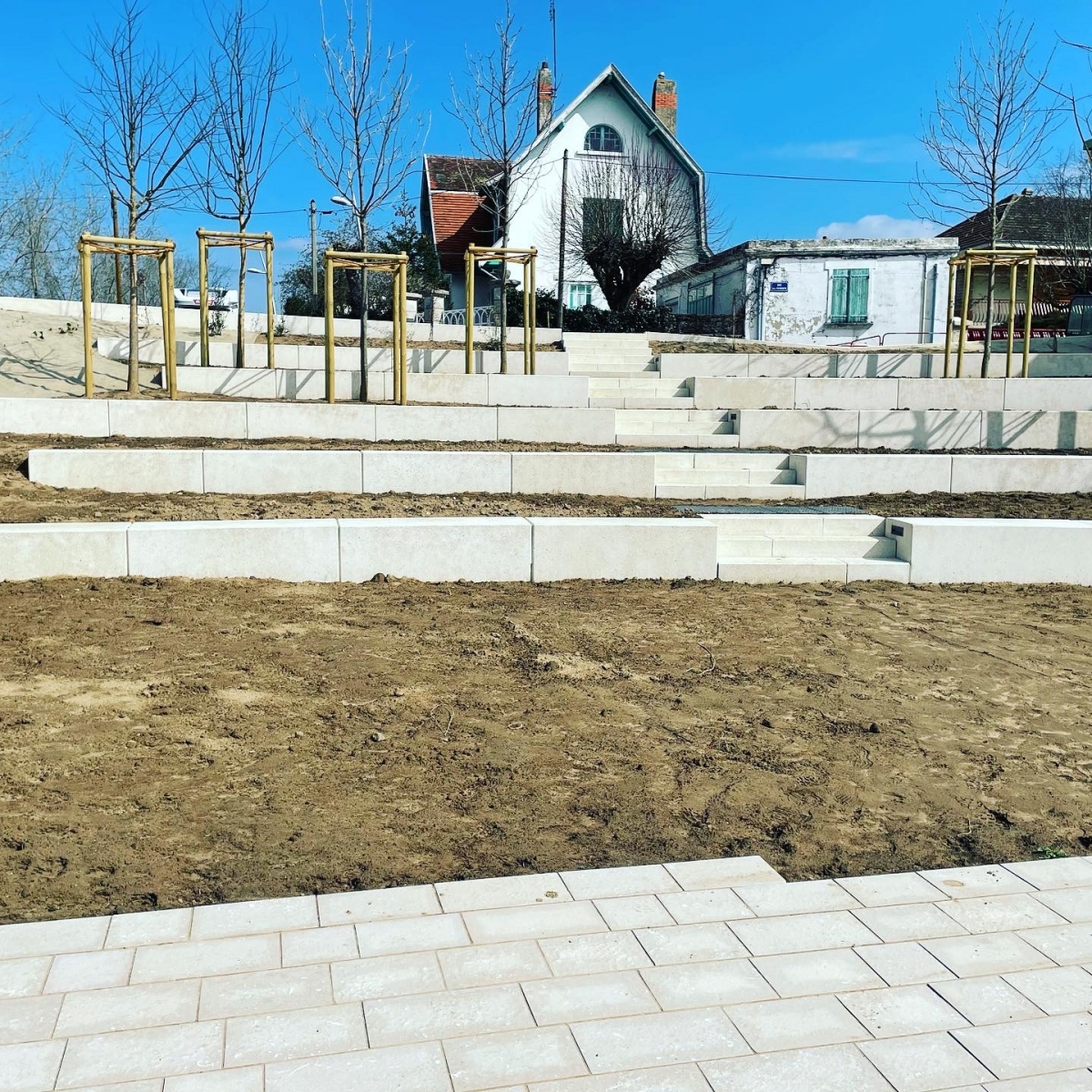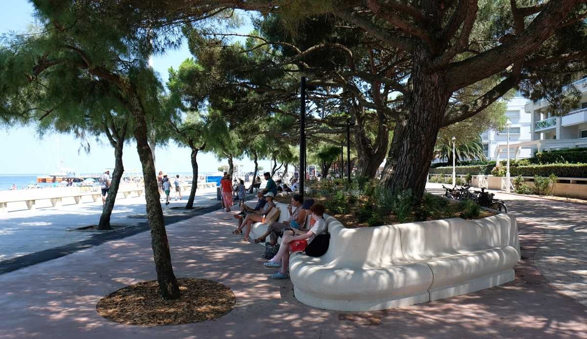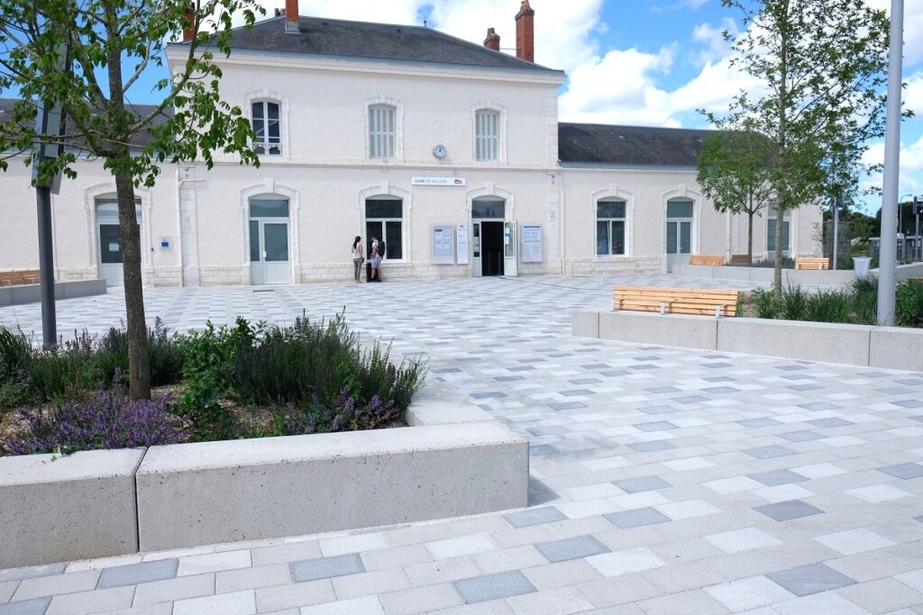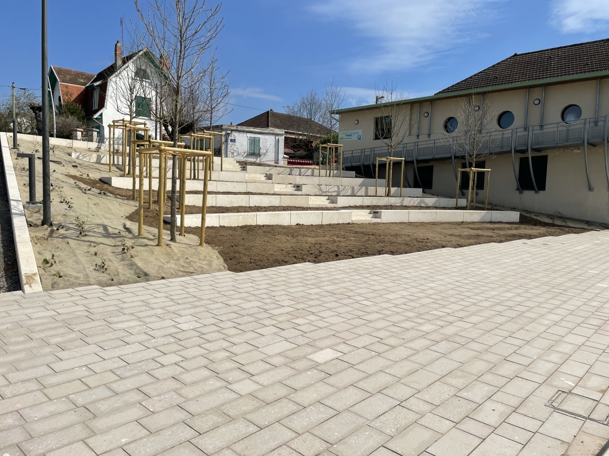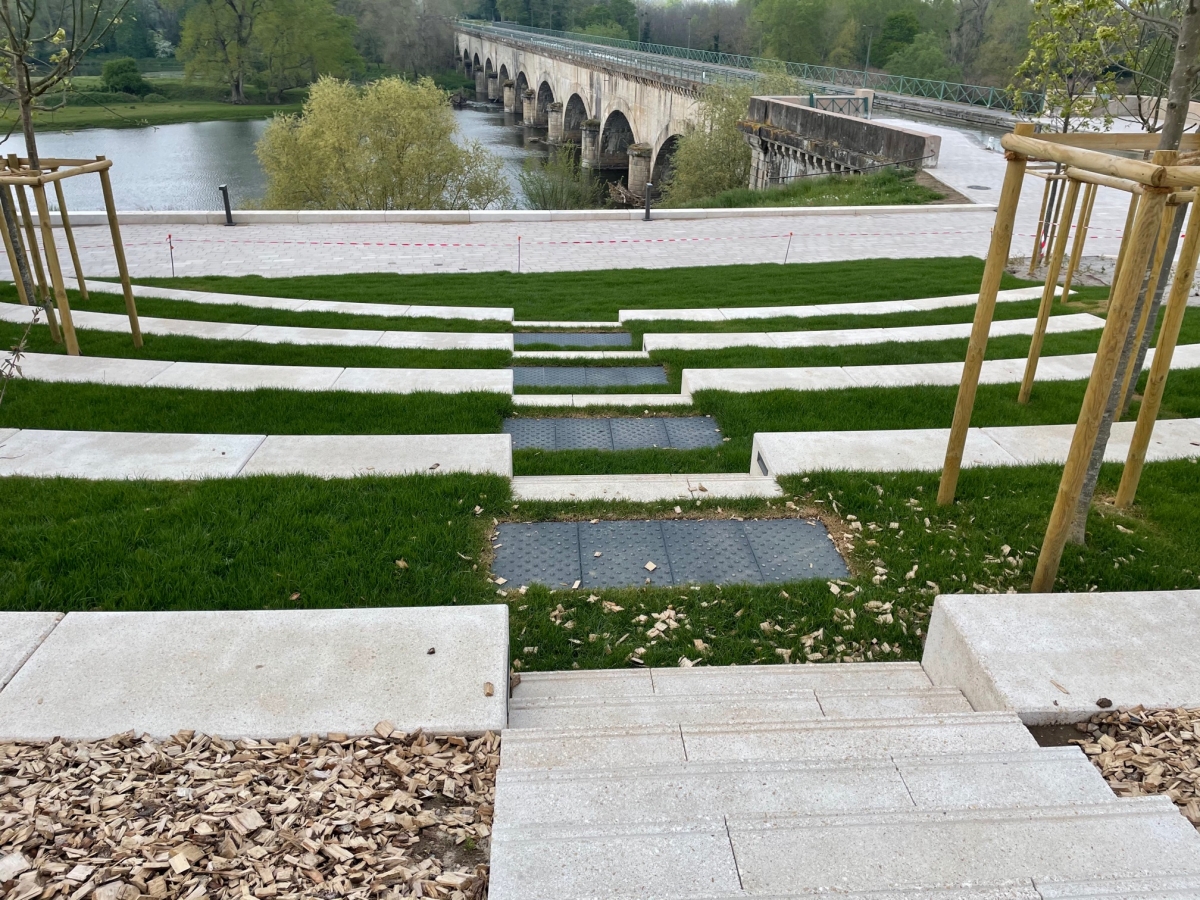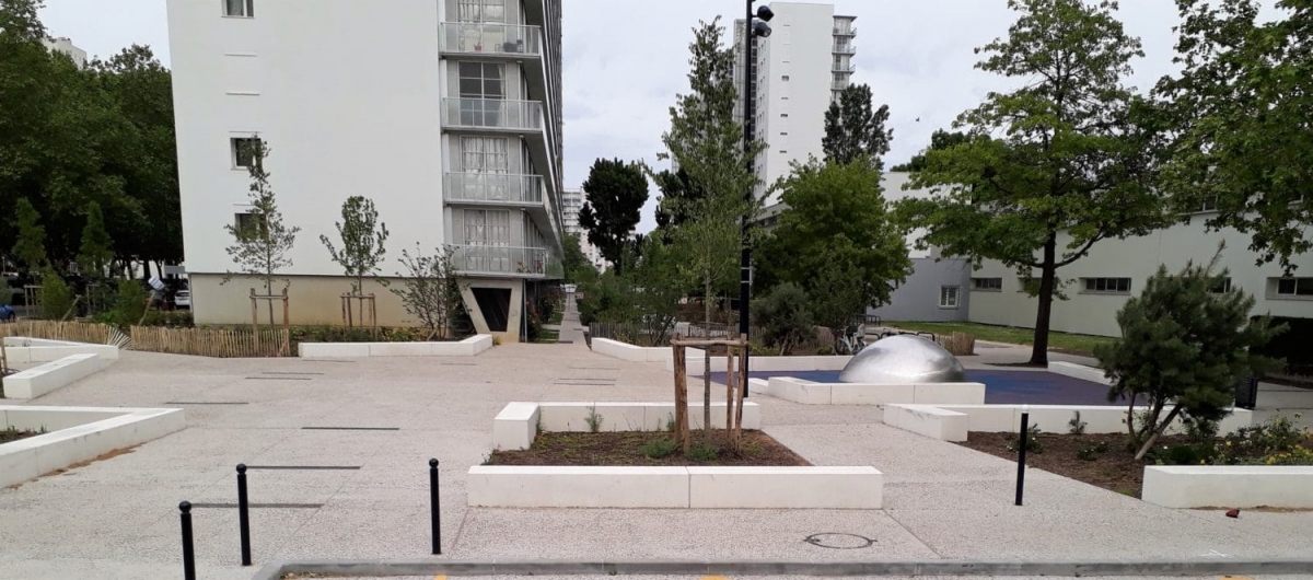 L'ingénieur paysagiste, Mme Ruelloux souhaitait des éléments préfabriqués avec la même matière, la même finition et pouvant être mis en œuvre avec différents revêtements.