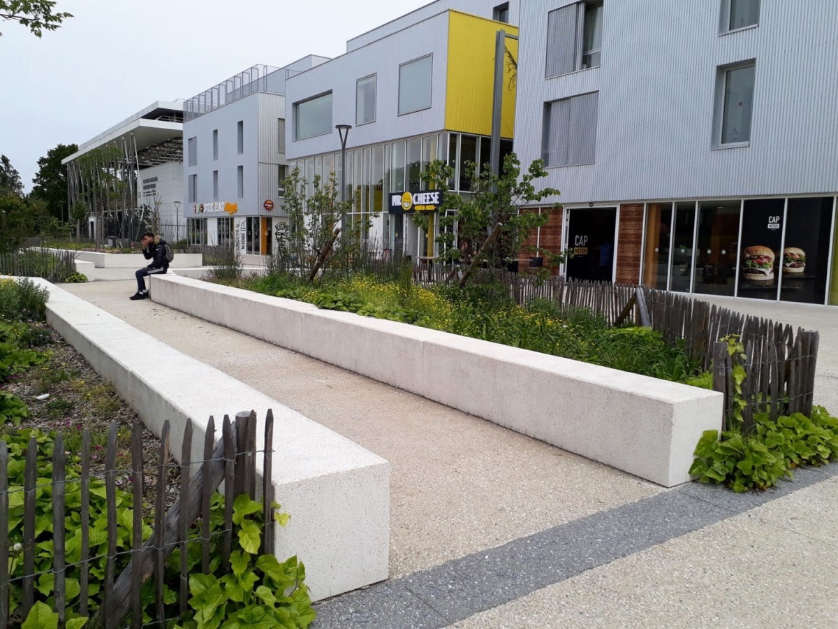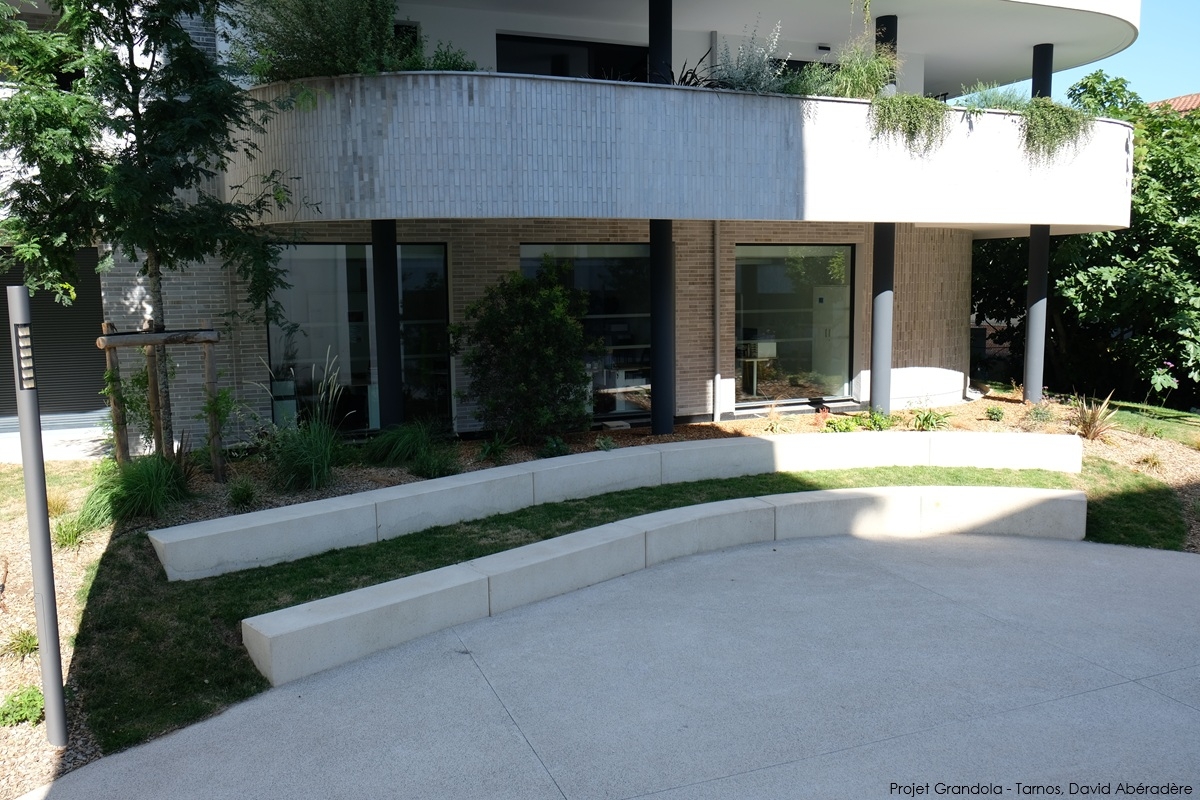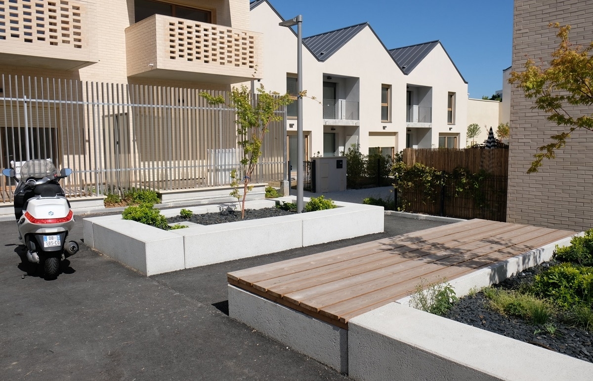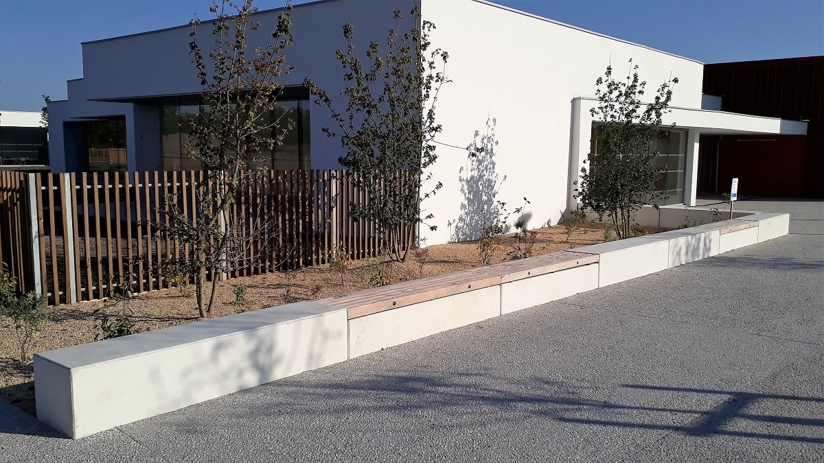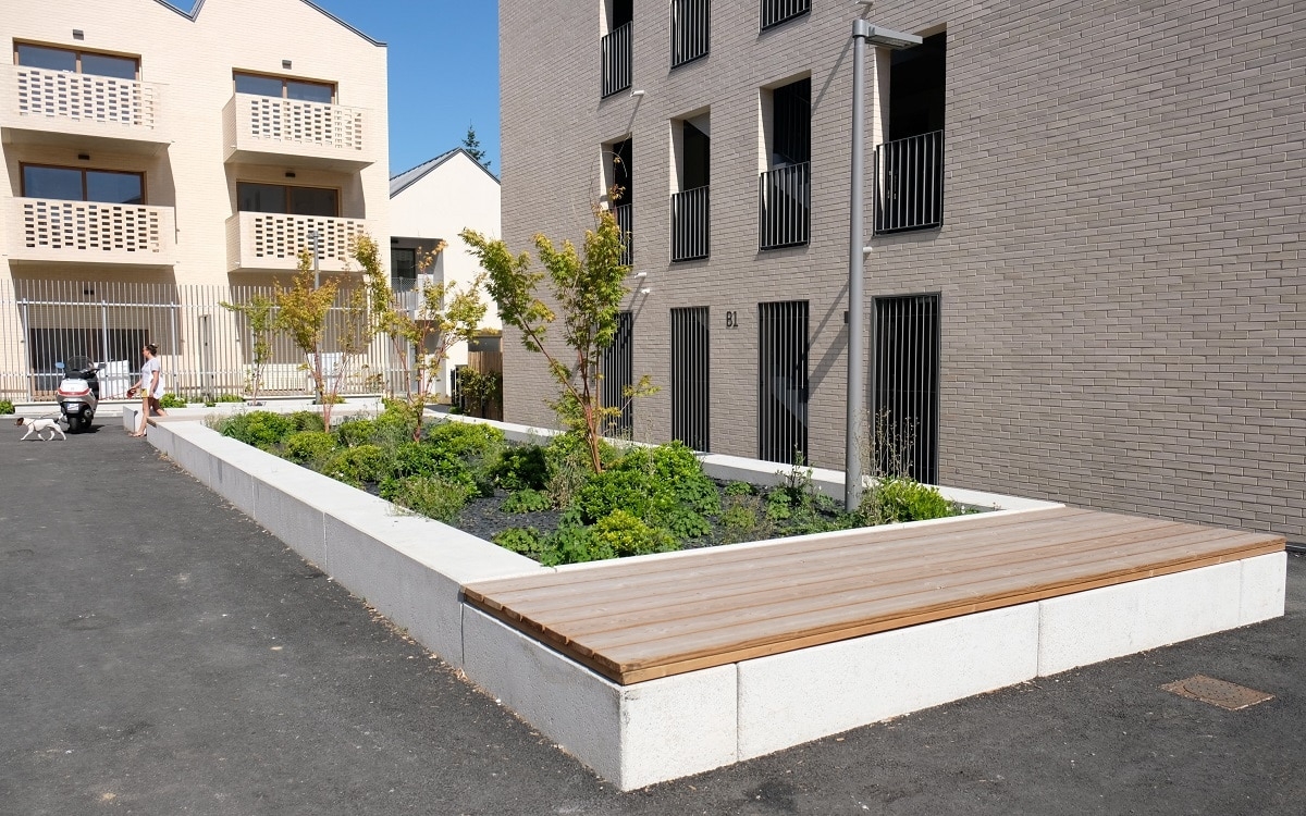 L'architecte Tistou Hoffmann a choisi la banquette MONEY pour séparer le parking de l'allée piétonne et a adapté sa finition pour que son aspect rappelle la façade du bâtiment.