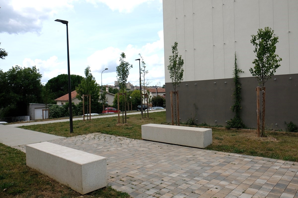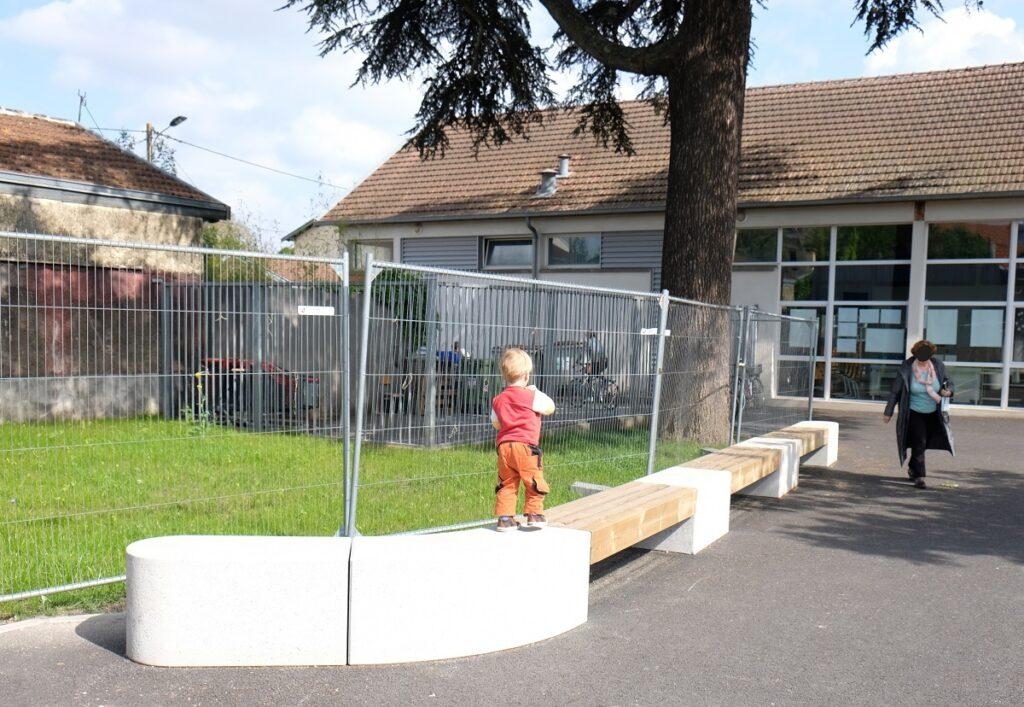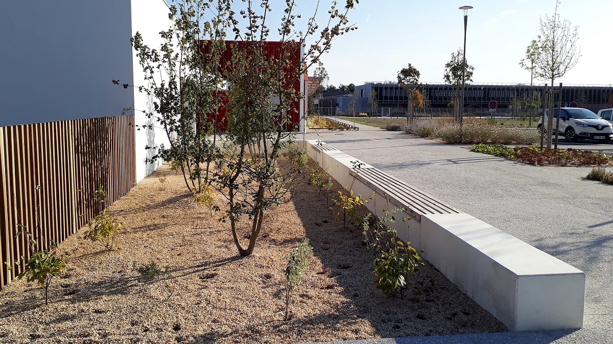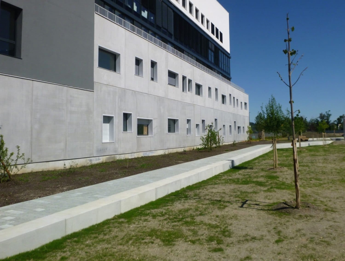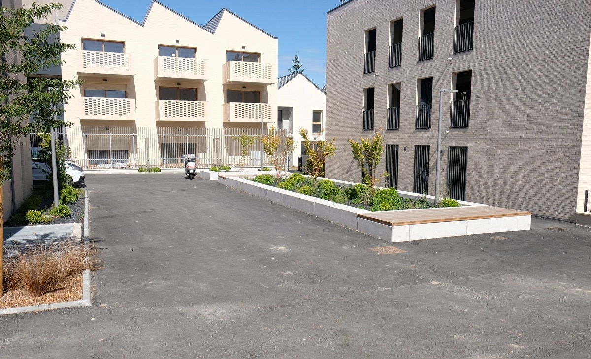 L'architecte Tistou Hoffmann a choisi la banquette MONEY pour séparer le parking de l'allée piétonne et a adapté sa finition pour que son aspect rappelle la façade du bâtiment.