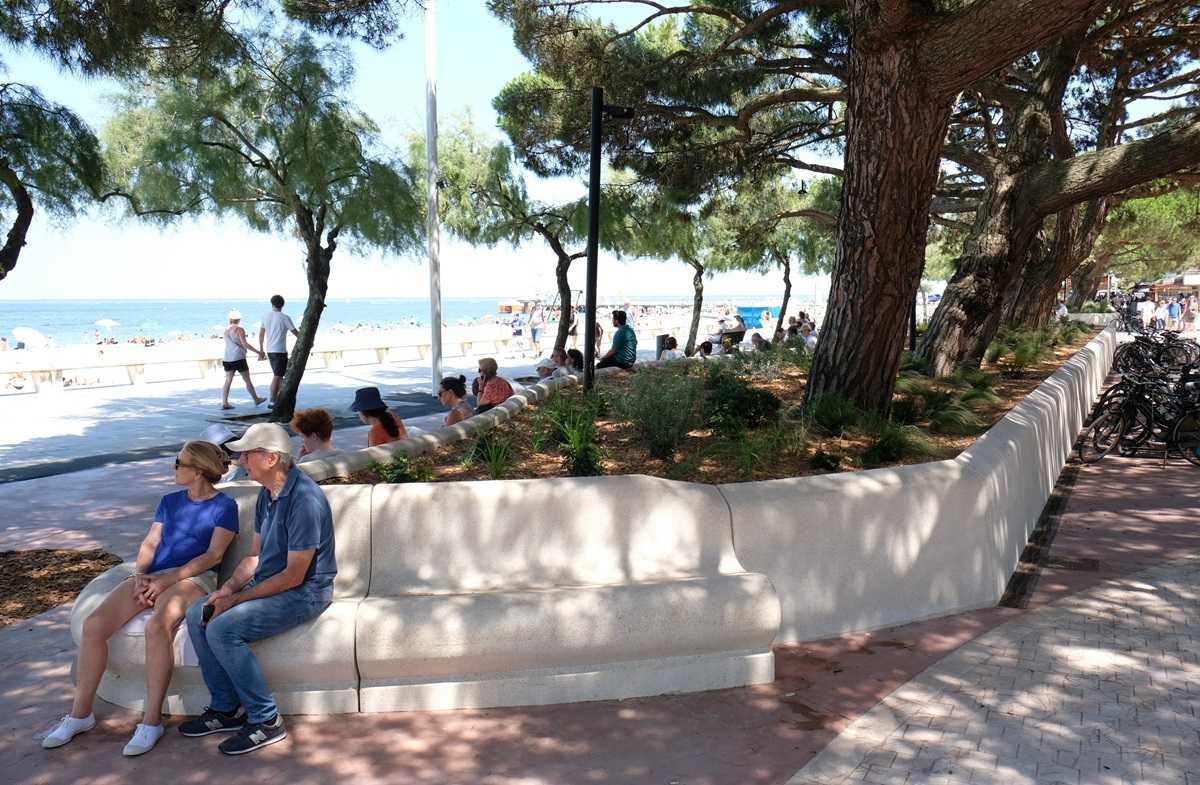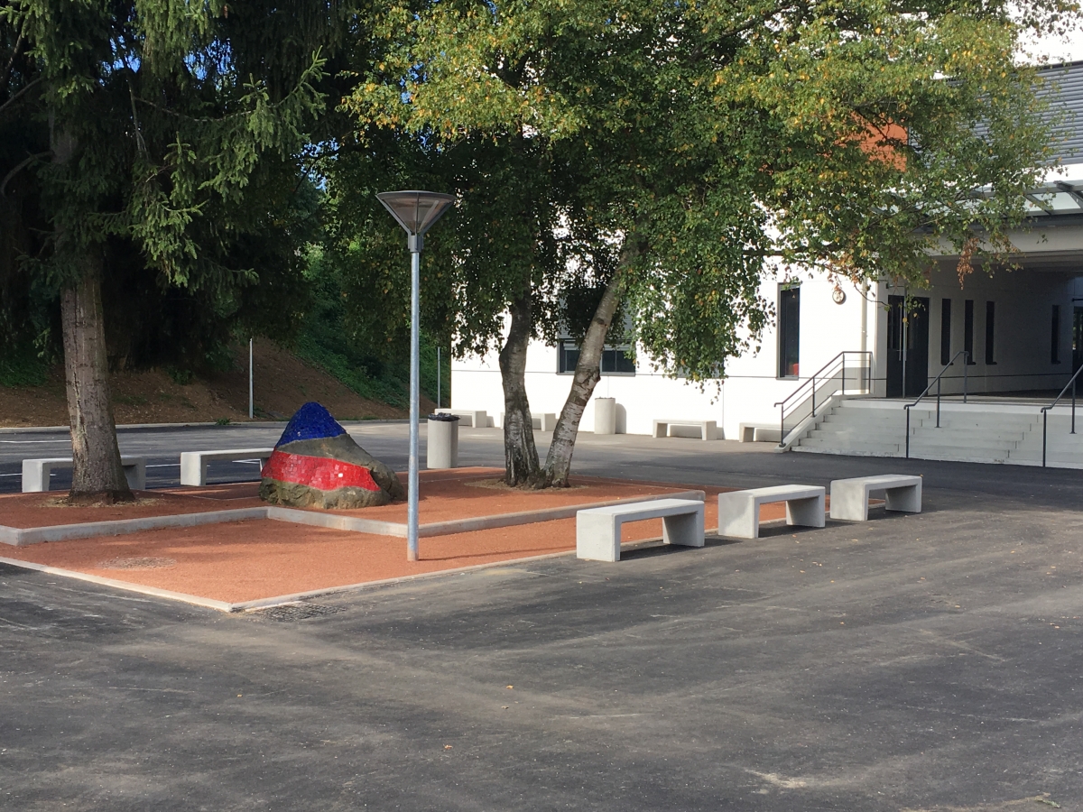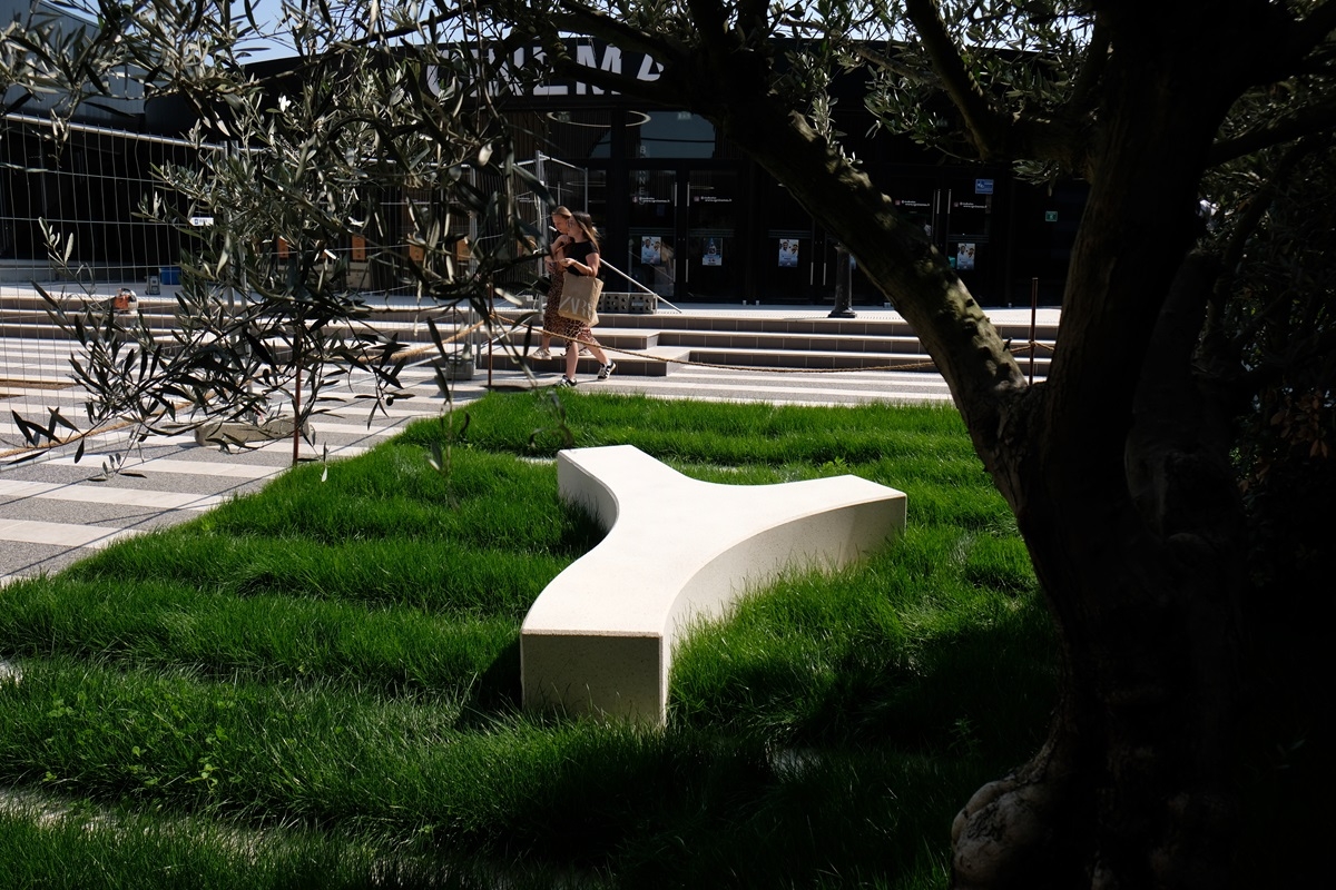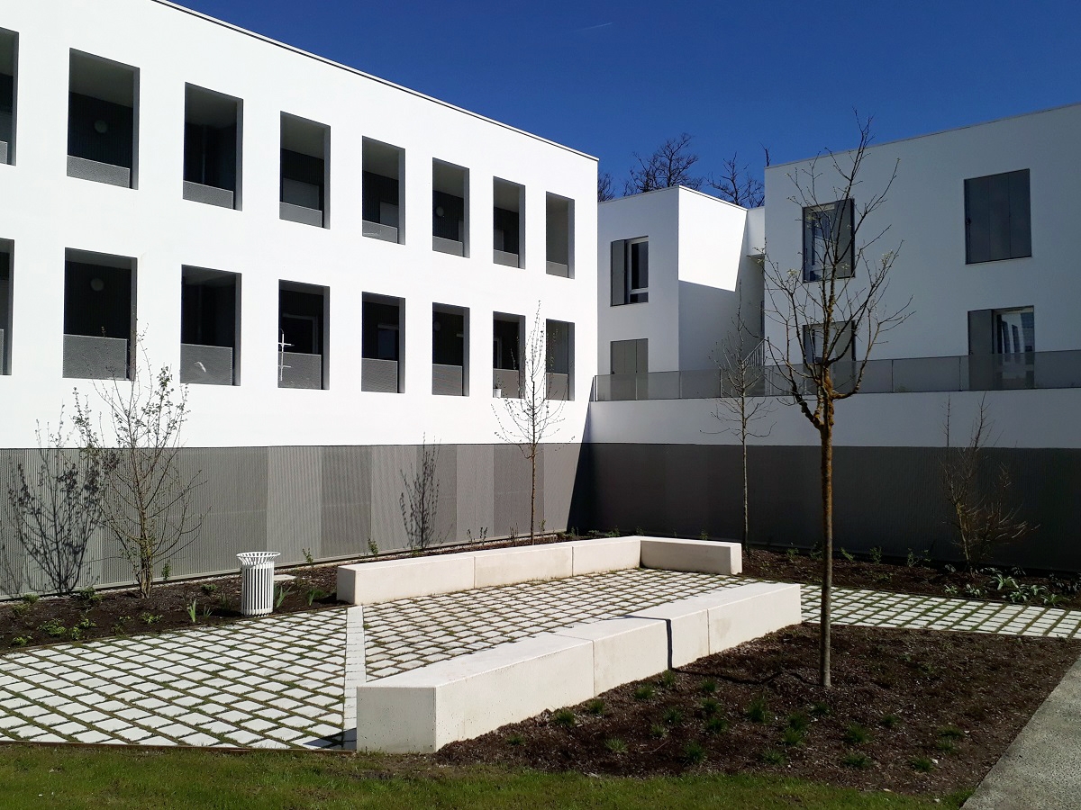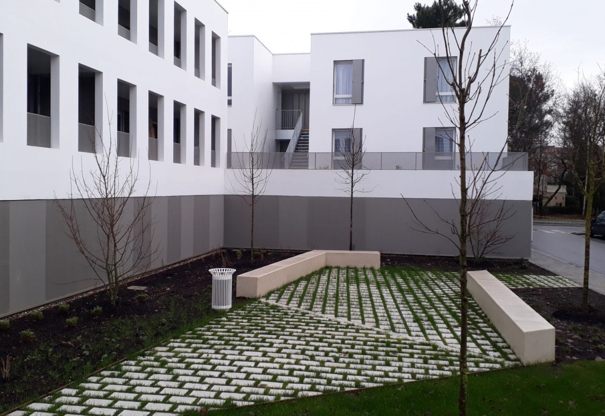 L'architecte Tistou Hoffmann a choisi la banquette MONEY pour séparer le parking de l'allée piétonne et a adapté sa finition pour que son aspect rappelle la façade du bâtiment.