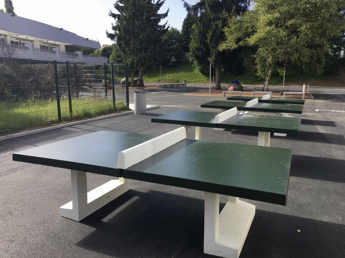 Produits : banquette STORY 150, corbeille BASIC et table ping-pong DUEL